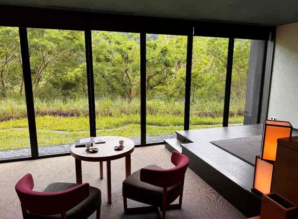 客廳中寬大的休憩臥榻就正對著落地窗,泡完溫泉後的休息配上窗外的景色,再來點小點🍵忘卻一切喧囂與壓力,單純地去感受大自然的寧靜與美好,真的是太享受了😍
