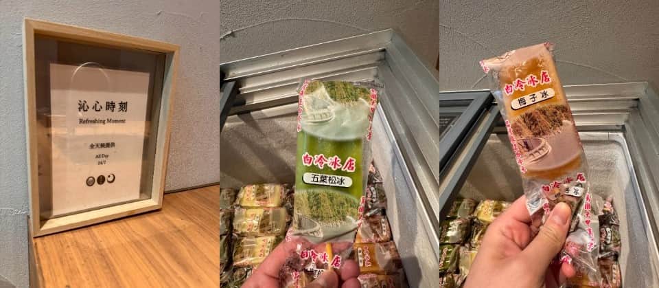 【沁心時刻】的白冷冰棒則是全天候24小時無限時提供🧊,好久沒吃到這種古早味冰棒了~泡完溫泉,來上一根冰棒會不會奢侈🤩!多種口味一次排開任君挑選,當然一定要來一隻白冷冰最具特色的五葉松冰,吃起來很特別是草葉的味道🌱口味喜不喜歡就見仁見智啦~但是搭配窗外景色倒是毫不違和🌿 專屬限定冰棒只吃一隻怎麼可能夠!大人小孩都沒辦法拒絕的梅子冰🥴,吃起來完全就是小時候的味道,酸酸甜甜的古早味十分消暑。