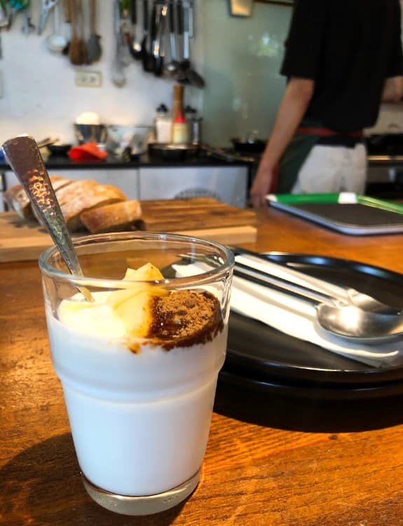 迷路為了看花除了無敵海景外,還有供應無菜單私廚料理🍽️,如果要在民宿內享用晚餐,記得前一天預約。早餐當然也是依當季食材變化的無菜單料理,這次的早餐是西班牙鐵鍋料理,當季地瓜、馬鈴薯和山藥切片層層堆疊🥔,搭配煙燻厚培根跟自製的番茄底醬🍅,沾點上頭的半熟蛋,完美的早餐就該如此~別錯過民宿自製發酵的優格,簡單配上水果跟黑糖粉,好吃到一口接一口🤤!