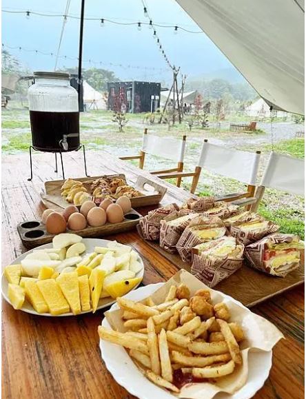 前一天晚上太盡興晚睡,不用擔心隔天早餐,最棒的是起床後只要通知櫃台,早餐就會直接送到每區的客廳帳。附贈的早餐也很豐富,依照入住人數提供現做三明治、水煮蛋、炸薯條雞塊、水果跟咖啡。