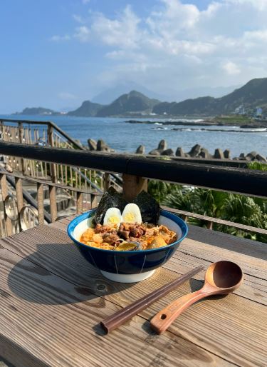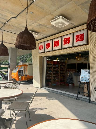 距離潮境公園約五分鐘路程,我們就抵達附近超夯的【小李海鮮麵】。這間店最大的亮點就是「配料自己選、海景無限看」非常遼闊的觀景台,吹著海風、看著蔚藍海天一線,一邊吃著高級拉麵,平價也可以享受觀景餐廳新的境界!